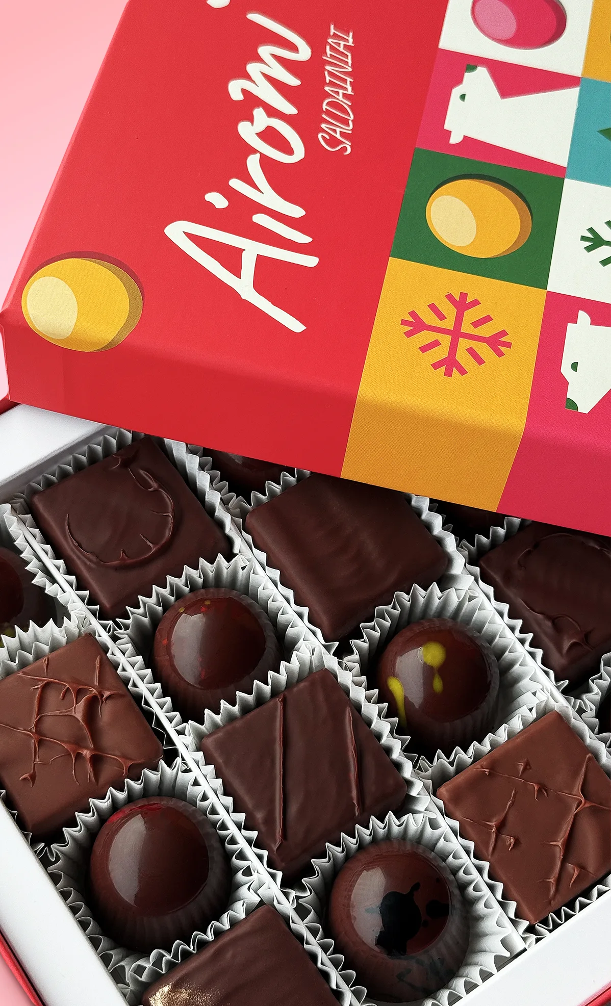 Gurmaniška degustacinė kolekcija: kruopščiai subalansuoti įdarai, šviežiai gaminami marmeladai, riešutiniai pralinė ir švelnūs ganašai, įlieti į prancūzišką Valrhona šokoladą.