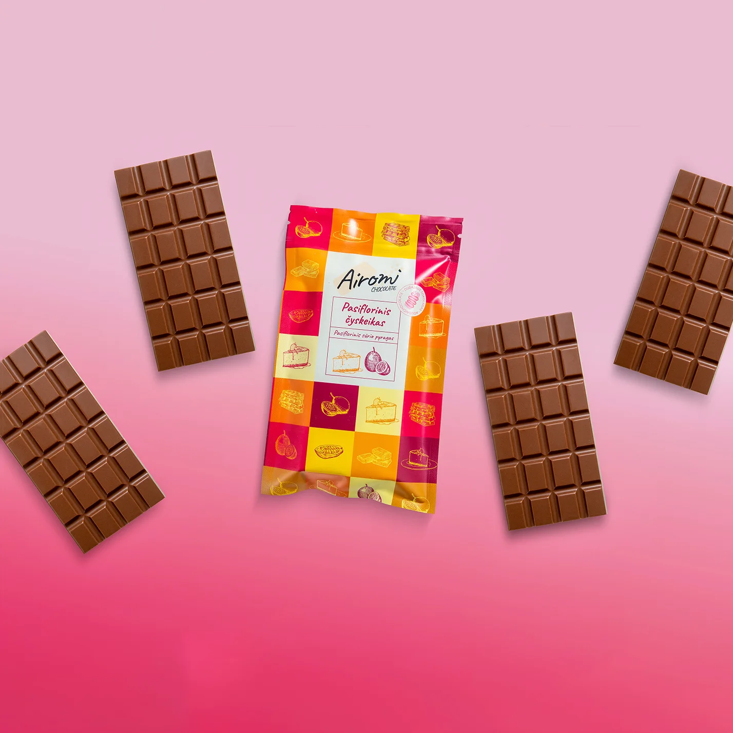SUDEDAMOSIOS DALYS: kakavos masė, cukrus, pieno milteliai, kakavos sviestas, grietinėlė 35%, sviestas, sūris, migdolų riešutai, gliukozės sirupas, kvietiniai miltai (glitimas), vanduo, druska, kiaušinis, kepimo milteliai, pasiflorų tyrė, pektinas NH.